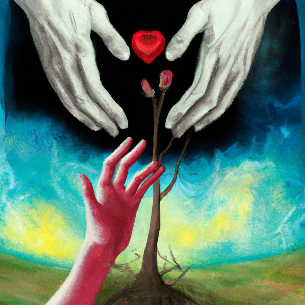 Le visuel de la pochette nous a beaucoup interpellé, on a pensé à la rencontre de Dieu et sa création, mais ici, Dieu sort des ténèbres… jetant à l’Homme des pétales en forme de cœur. Cette image soulève l’idée que l’amour serait forcément accompagné de noirceur et tristesse.