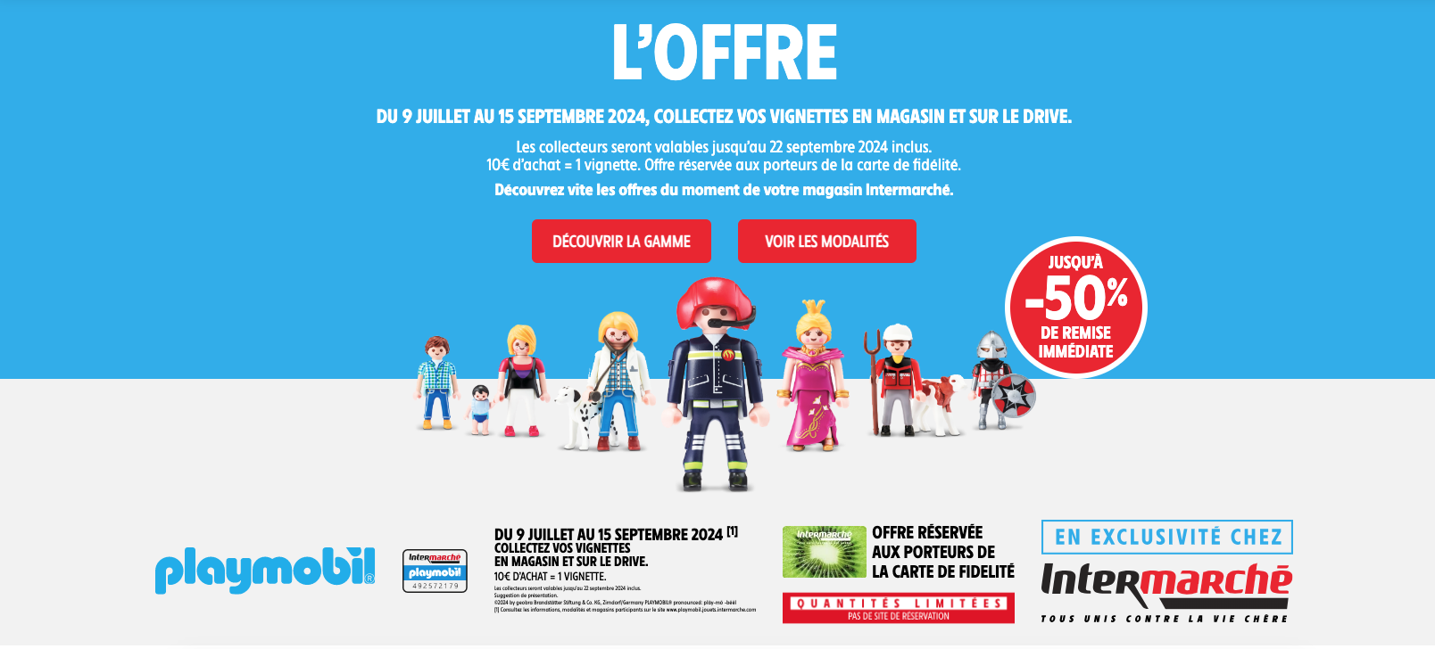 - Complétez votre collecteur : Accumulez 10 vignettes pour obtenir une remise immédiate jusqu’à -50 % sur un article PLAYMOBIL® de votre choix parmi les articles disponibles. Consultez la liste des articles et les modalités sur www.playmobil.jouets.intermarche.com.