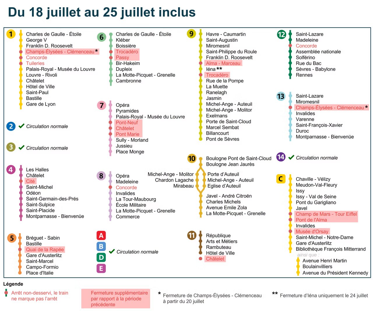 Les stations concernées par ces nouvelles mesures de sécurité incluent Cité (ligne 4), Quai de la Rapée (ligne 5), Trocadéro et Passy (lignes 6 et 9), ainsi que Pont-Neuf, Châtelet et Pont Marie (lignes 7 et 11). Pour le RER C, les stations Champ de Mars-Tour Eiffel, Pont de l’Alma et Musée d’Orsay ne seront pas desservies non plus.
