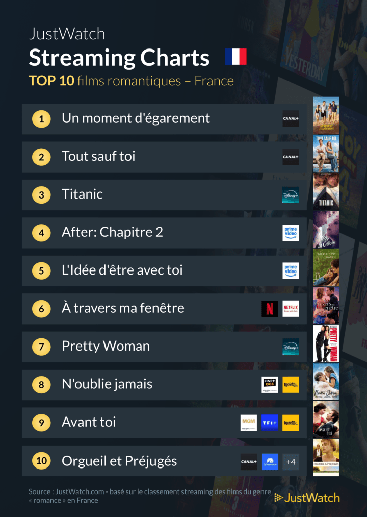 Avec une telle variété, il y en a pour tous les goûts ! Alors, quel sera votre choix pour une Saint-Valentin placée sous le signe du cinéma et de l’amour ? Retrouvez les classements en temps réel sur JustWatch