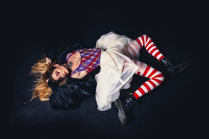 La nouvelle iconographie proposée par June The Girl est en parfaite adéquation avec l’album ! On y découvre une artiste qui incarne le clown triste et l’Arlequin moderne, figure ambiguë entre la fête et la mélancolie. Les cheveux en mouvement, le maquillage marqué de larmes noires, les collants rayés rouge et blanc ou encore la robe sertie de perles, tout compose une esthétique de cirque décalé, mais profondément mélancolique. L’Arlequin, traditionnellement joyeux, se transforme ici en miroir de la fragilité intérieure. Le corps alangui au sol, les yeux cernés d’une douleur maquillée, June the Girl se donne en spectacle comme une héroïne qui rit de sa propre chute.