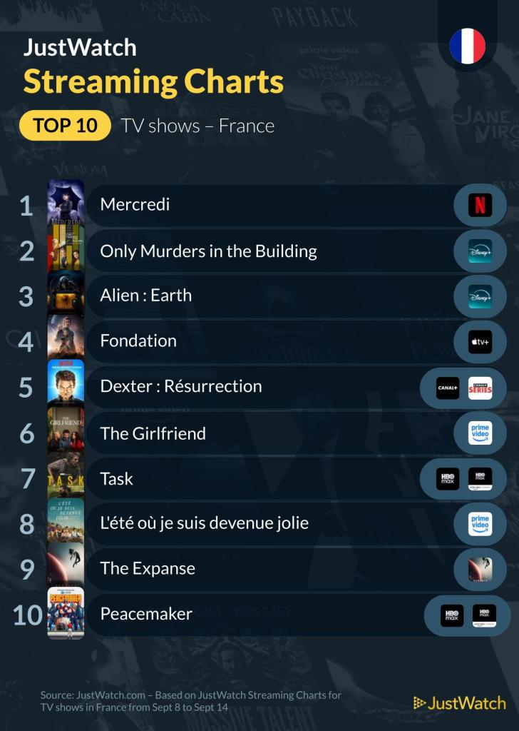 Du côté des séries, la reine reste Mercredi, l’ado gothique de la famille Addams, plongée dans l’ambiance surnaturelle de la Nevermore Academy. Entre humour noir, pouvoirs psychiques et meurtres mystérieux, la série continue de séduire un large public. En deuxième place, Only Murders in the Building confirme son statut de référence dans le true crime comique, grâce à ses trois détectives amateurs new-yorkais, leur podcast improvisé et une enquête haletante ponctuée de rebondissements. La troisième marche du podium revient à Alien : Earth, qui replonge les spectateurs dans l’univers sombre des xénomorphes, tout en explorant des enjeux de mémoire, d’éthique et de survie en 2120.