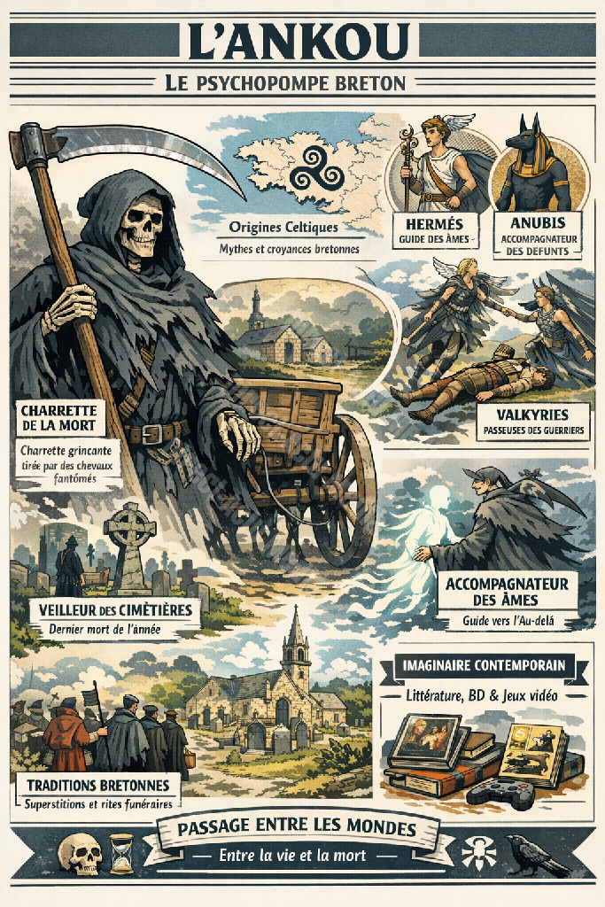 À travers l’Ankou, la Bretagne a conservé un mythe universel et profondément humain : celui du passeur entre les mondes. En réconciliant la peur de la mort avec le devoir de mémoire, cette silhouette des chemins bretons rappelle que le psychopompe n’est pas messager de terreur, mais guide de sens et de passage.