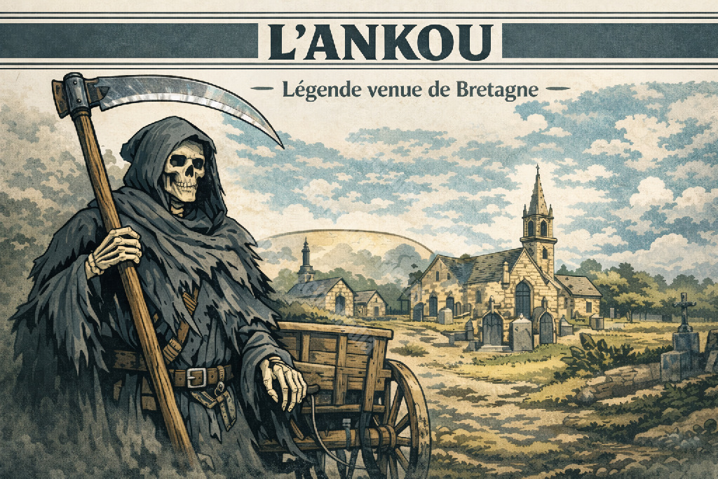 Son image est reconnaissable : silhouette haute et décharnée, capuchon sombre, faux à la main, souvent montée dans une charrette grinçante tirée par des chevaux fantomatiques. Ces attributs, popularisés dès le XIXᵉ siècle notamment dans les récits collectés par Anatole Le Braz, symbolisent la présence quotidienne de la mort dans la Bretagne rurale. Loin d’un simple épouvantail, l’Ankou personnifie le respect dû au passage, une figure de médiation entre le monde visible et celui des esprits. Il rappelle aussi l’ancrage chrétien du territoire breton, où les processions et pardons ont intégré cette mémoire païenne dans le calendrier religieux.